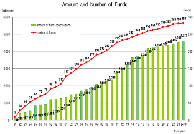 The number of funds donated came to 282, and the cumulative amount of their contributions reached 4,569,573,383 yen for around 33 years between 1991 and August 2024. OCF has received 30 applications for the bequests by a will, out of which 7 turned into permanent funds.