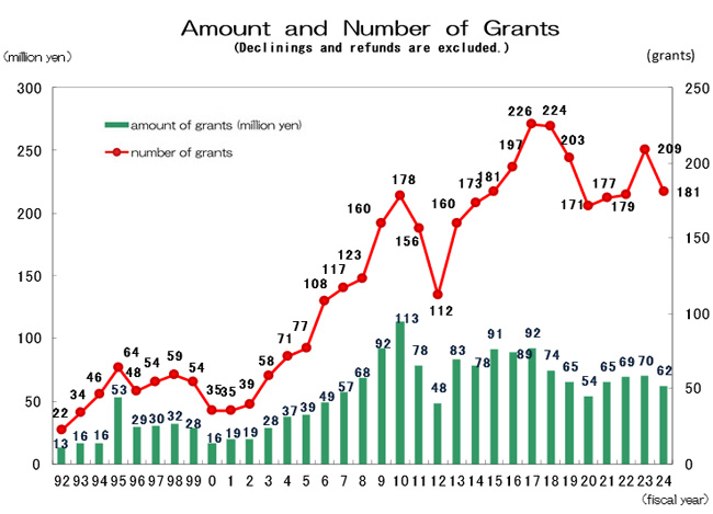 On the other hand, the number of grants for fiscal 2024(granted in April) was 181, and their amount totaled 61,805,080 yen. The aggregates since OCF's founding in 1991 are 3,931 grants and 1,770,878,939 yen respectively.(Declinings and refunds are excluded.)
